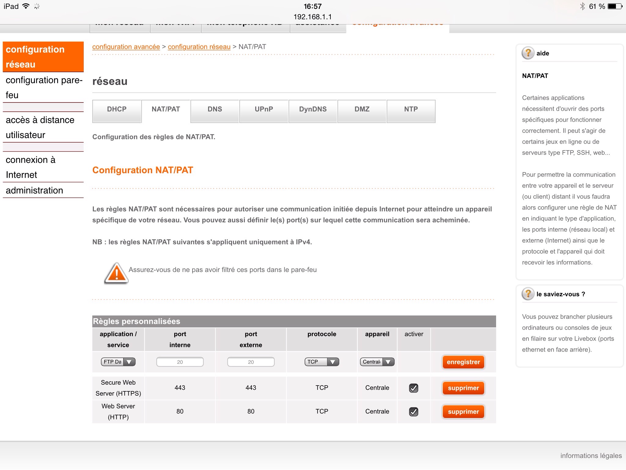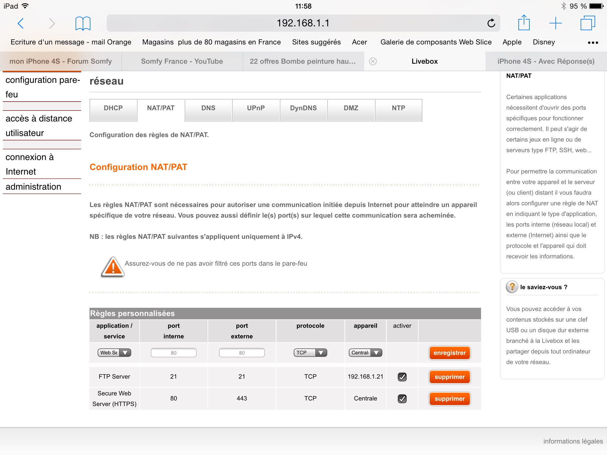 Pourtant le port https 443 / 80 est ouvert dans la livebox et la çentrale à une adresse IP fixe en DHCP et voir la deuxième photo pour la connexion NaT/PAt en HTTPS.