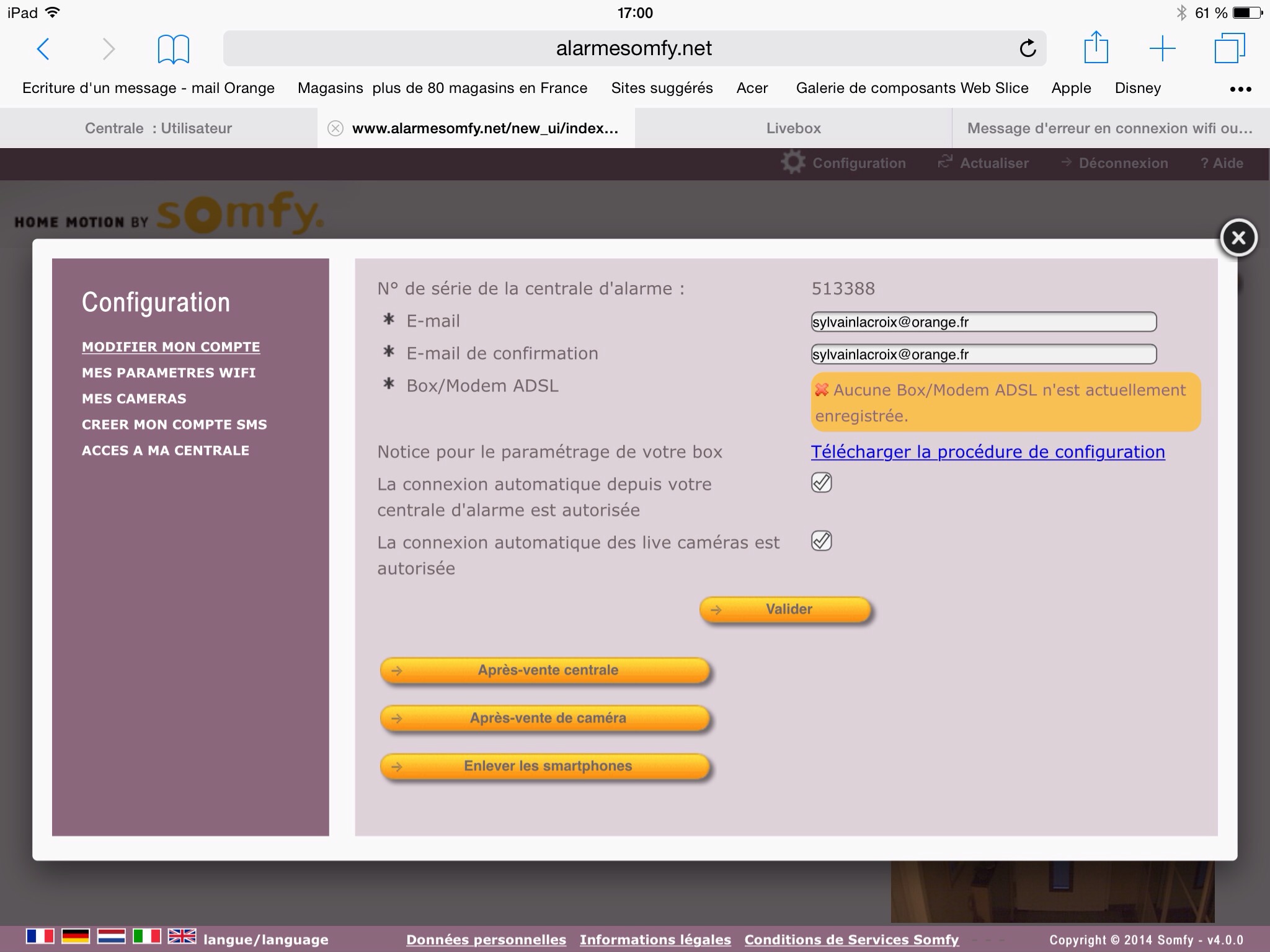 Quand je rentre en utilisateur, mes caméras, réglages, modifier mon compte je trouve le message indiqué sur la photo concernant la livebox.