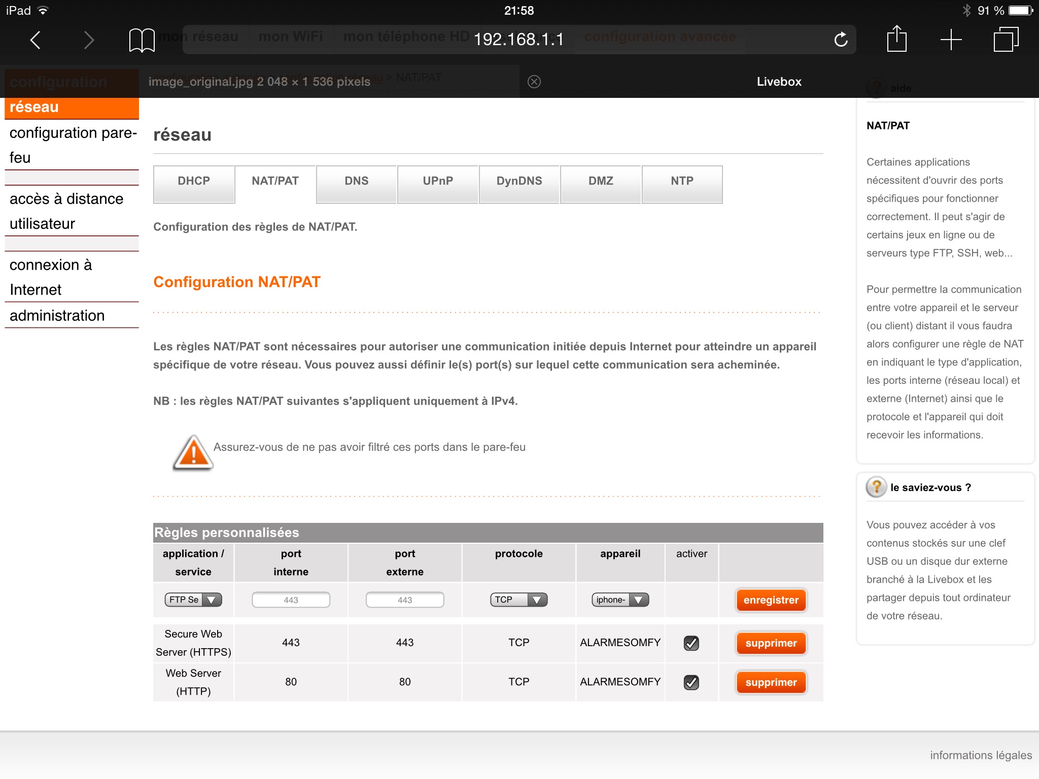 Depuis mon achat de l'alarme (août 2014) je n'arrivais pas à me connecter à distance à ma centrale via l'appli Somfy que se soit en 3G ou en wifi (sur iPhone comme sur Samsung galaxy) alors que le 80 et le 443 sont ouvert sur mon interface d'admin de ma live box sagem et que l'appli est bien paramétrée je pense. De chez moi aucuns problèmes.