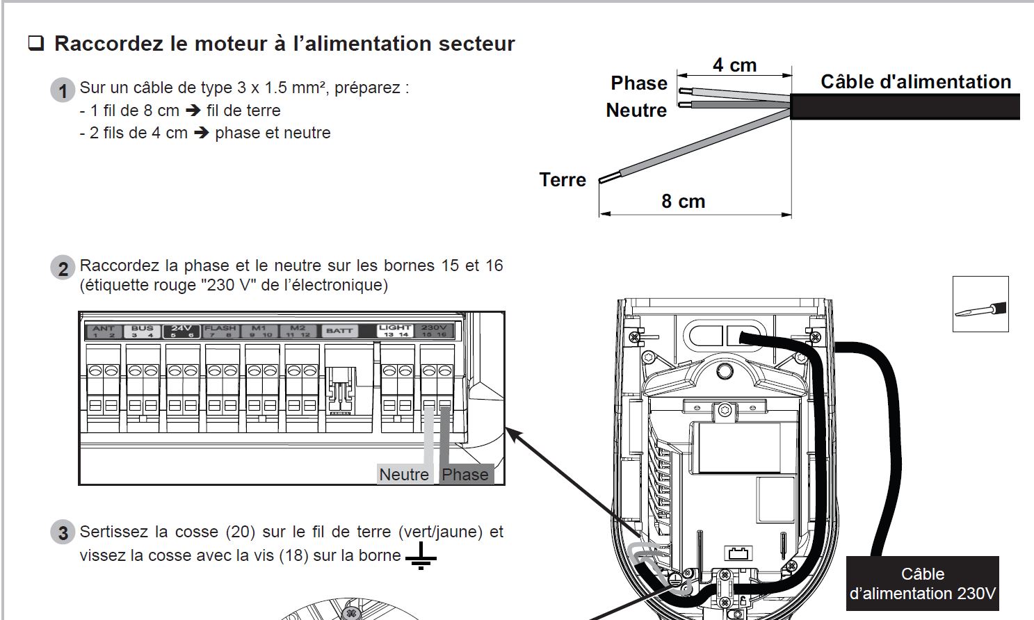 Couper le secteur 220v, faire le câblage sur le bornier rouge "230v" 15 neutre 16 phase. (Voir FJ)