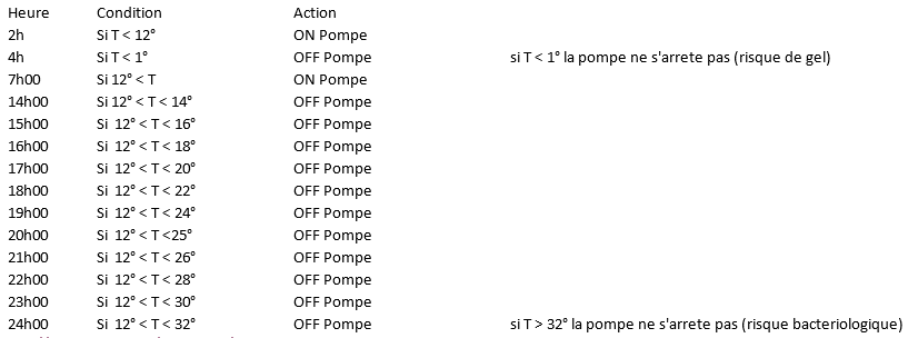 La colonne Heure de son tableau , c'est l'heure de d' éclenchement ou c'est le nombre d'heures où la pompe doit tourner en fonction de la température.