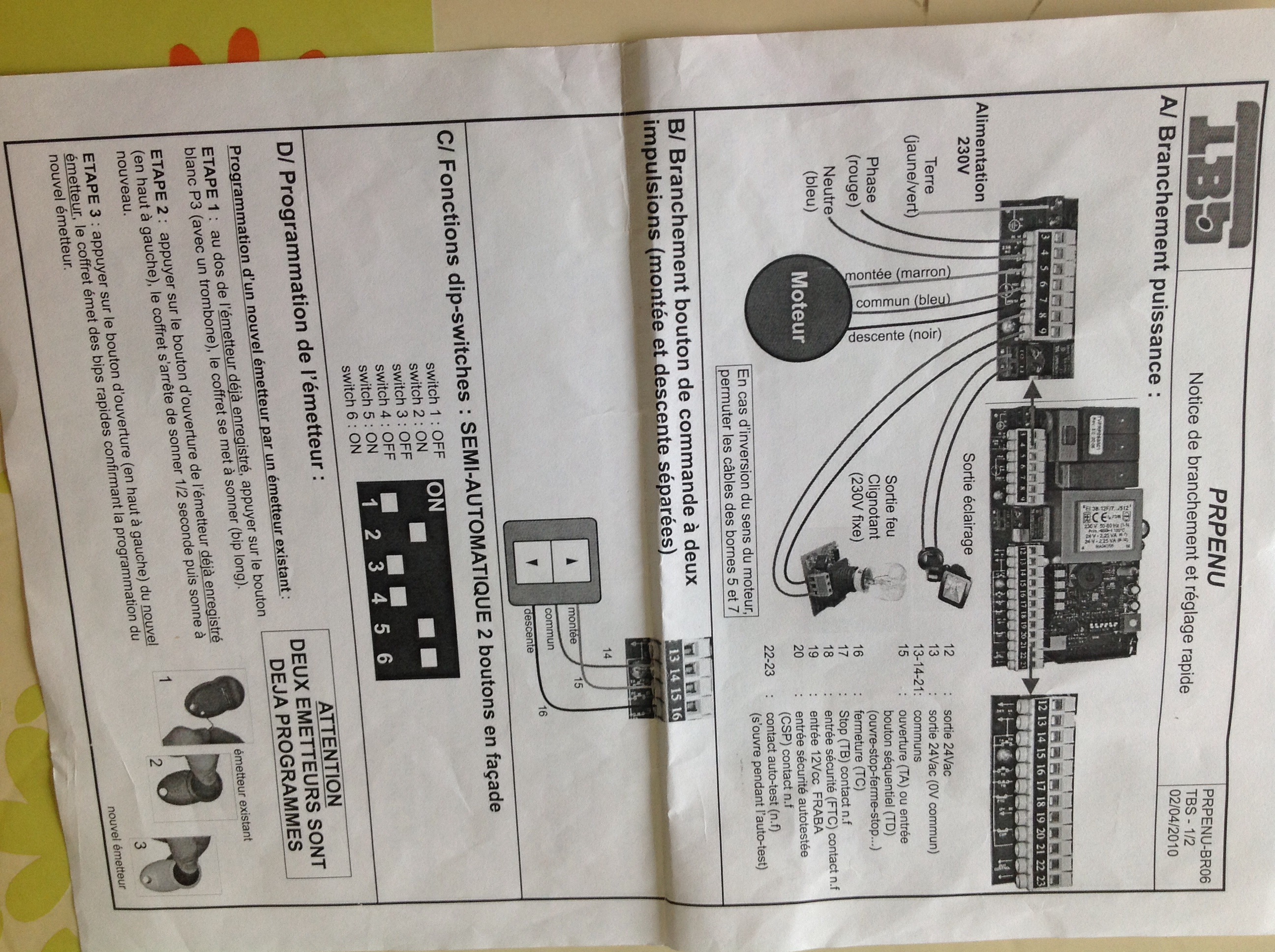 Bonjour pouvez vous me dire sur quelle bornes je doit brancher le Récepteur RTS universel standard sur le moteur teleco tbs provenu-br06.merci