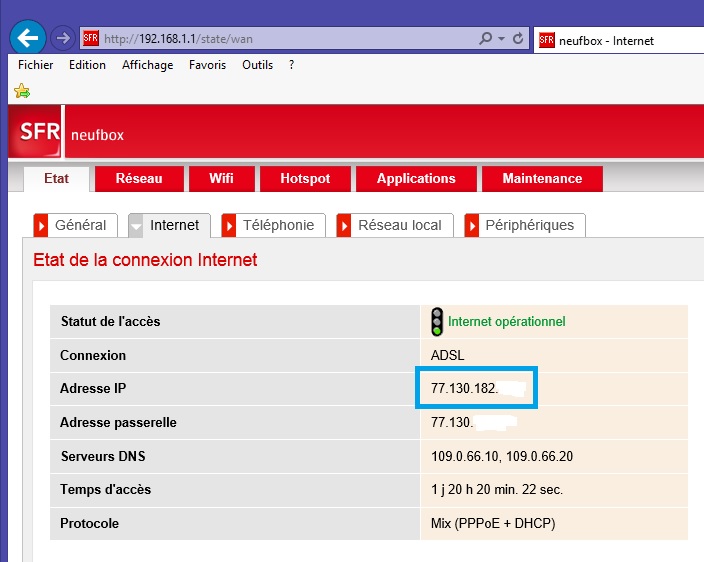 Votre box a une adresse IP publique qui se trouve à la page comme dans l'attachement ci joint.