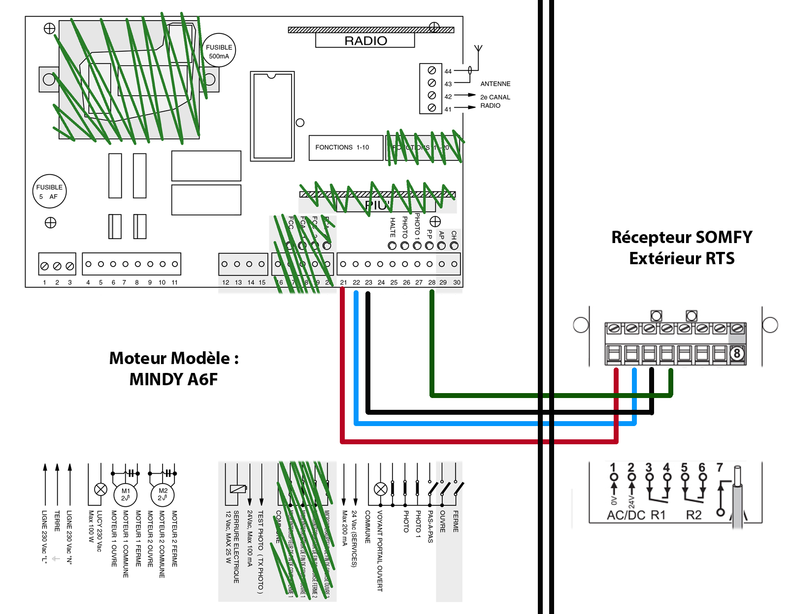 Je souhaiterais brancher mon récepteur extérieur RTS SOMFY sur ma motorisation de portail battant deux vantaux (Moteur MINDY A6F), afin de télécommander ma porte de garage (Motorisation SOMFY) et mon portail de clôture.