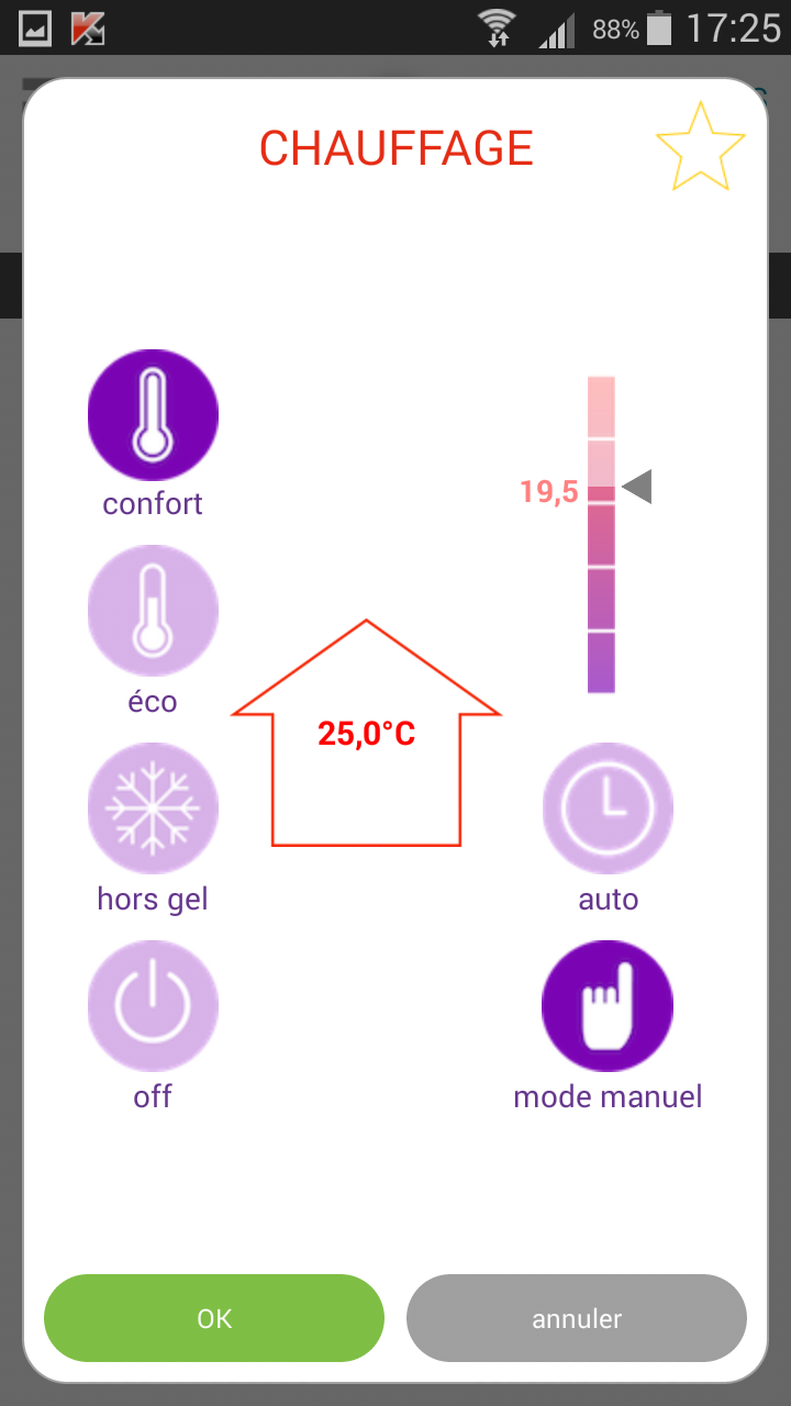 Quand je lis 25° sur le smartphone, avec le même écran, je lis 21,5° sur la tablette le pc, et bien entendu en direct sur le boitier de somfy; donc c'est faux!