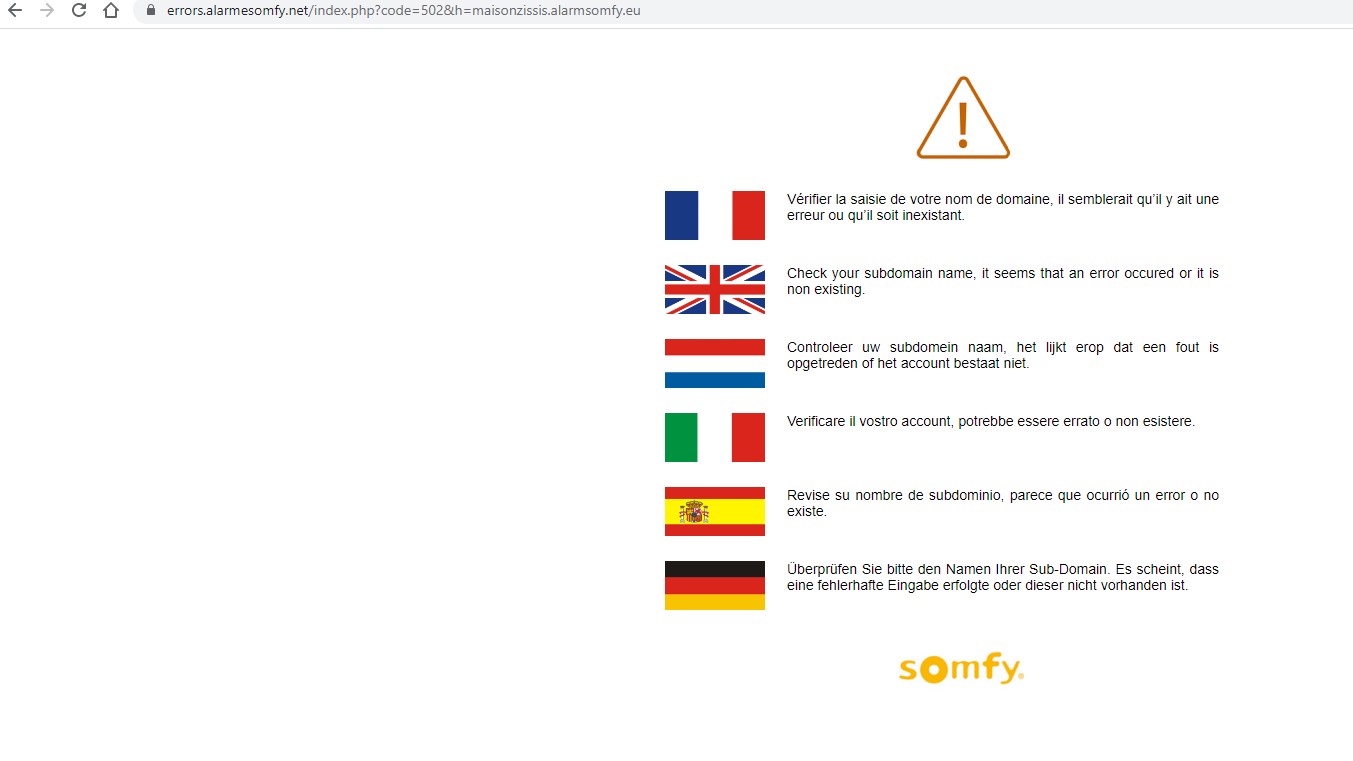 je suis aller sur alarmesomfy.net et une fois connecté, j'ai cliqué sur l'onglet "accès a ma centrale" et le message suivant apparaît:"Vérifier la saisie de votre nom de domaine, il semblerait qu’il y ai une erreur ou qu’il soit inexistant."