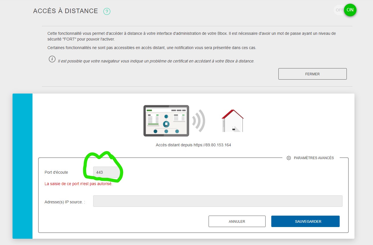 Pour ceux qui serait dans la même situation, voici la capture d'écran. Il suffit de désactiver l'accès à distance de sa Bbox (qui ne sert quasiment à rien) pour que ca refonctionne.